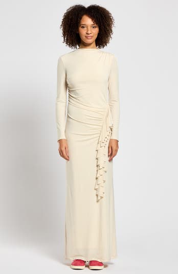 The charlotte jacquard maxi dress features elegant long sleeves and a striking side frill detail at the front, creating a sophisticated yet playful silhouette. Perfect for any occasion, this dress blends modern style with timeless elegance.