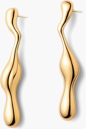 Liquid gold. Defined movement. The Magma Drop Earrings in 18ct gold plating are sculpted to echo the fluidity of molten metal suspended in motion. Their elongated, organic silhouette drapes elegantly from the lobe, creating soft movement and a striking, light-catching presence.