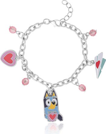 Bring the play. This Bluey charm bracelet mixes the lovable pup with heart and love-note charms plus pink crystal drops. An extender grows with them—perfect for birthdays, playdates and school spirit days.