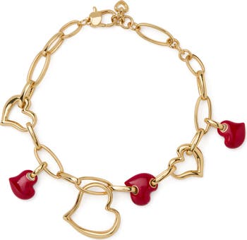 Fiery hearts charm this delicate chainlink bracelet made in a glinting golden finish.