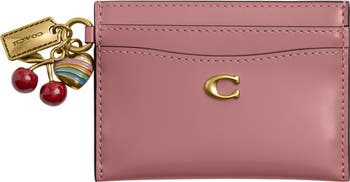 A trio of charms adds a playful flourish to this logo-branded card case designed in a slim silhouette from glossy leather.