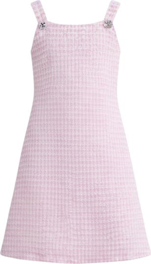 - Features a soft pink tweed fabric with a structured, polished silhouette