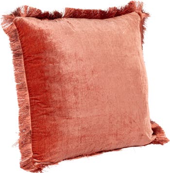 - A serene statement, this pillow is wrapped in a clay-colored fabric blend, highlighted by soft eyelash fringe