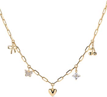 We created your new favorite charm necklace. Plated in 14k gold, this playful necklace features varying charms in a few of our fave silhouettes. Great for gifting or for treating yourself, this charm necklace is a versatile addition to any jewelry collection. Add a sparkly touch to your look by styling this necklace with our Suzanne hoops. Water-resistant and tarnish-free.
