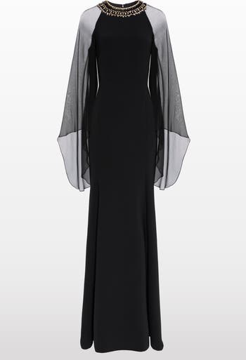Charma is a dramatic floor-length gown that blends sculptural elegance with soft ethereal details. The figure-skimming bodice is tailored to perfection, creating a statuesque silhouette that flows gracefully into a floor-length hem. Sheer billowing sleeves introduce lightness and movement, their delicate fabric catching the light for a luminous effect. The neckline is accented with hand-applied crystal embellishments, adding subtle contrast and refined shine. This gown is ideal for black-tie weddings, upscale receptions, or any occasion where elegance meets bold design. Charma is for the modern woman who embraces both strength and softness in her eveningwear a luxurious gown that combines high-fashion tailoring with romantic fluidity.