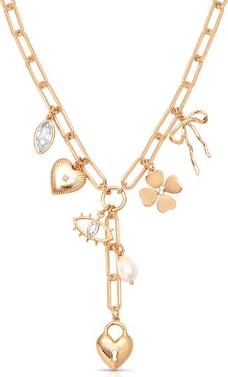 A freshwater pearl, cubic zirconia and assorted charms shine sweetly from this lariat-inspired paper clip–chain necklace aglow in fine 18-karat gold plate.
