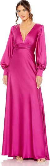 Elegant charmeuse gown with a flattering V-neckline and bishop sleeves. Perfect for formal occasions, this style adds sophistication and timeless charm.