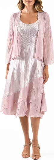 From suitcase to sensational entrance, this wrinkle-resistant combo of charmeuse and chiffon is cut into a midi dress that will never show its mileage. It's paired with a sheer jacket to complete your look.