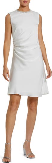This stunning charmeuse mini dress features a fitted waist to accentuate your silhouette, while the rhinestone-trimmed high neckline adds glamour. Perfect for evening events and special occasions.