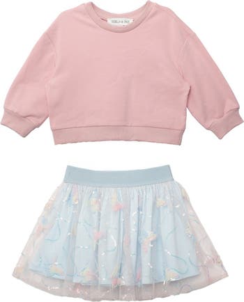 • The Chasing Butterflies two piece set includes a pastel pink sweatshirt with ribbed cuffs and a hem for a relaxed fit, paired with a light blue tulle skirt featuring a shimmering overlay of sequins and delicate floral accents. Designed for effortless style and comfort, this set is perfect for playful days or special occasions. Fabric Content & Care 95% COTTON 5% SPANDEX Machine Wash Cold