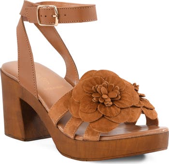 Voluminous floral appliqués add stylish whimsy to an Italian suede sandal lifted by a woodgrain platform and chunky block heel.