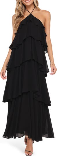 Cascading tiers and a tie-up halter neckline bring gorgeous movement to this flowy maxi. The A-line shape skims the figure and sways with every step, while a pull-on design and full lining make it an effortless pick for dinners, parties and beachside weddings.