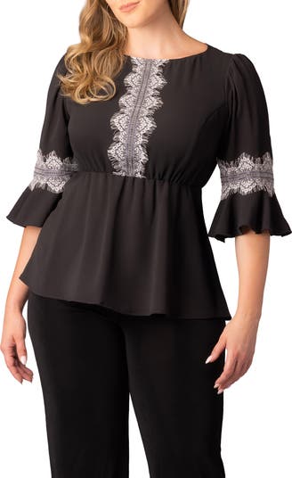 Lovely eyelash lace romances this figure-skimming top framed by fluttering frilled cuffs and a flouncy peplum.