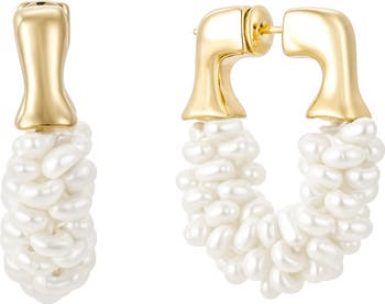 Our Chateau Pearl Hoops feature clusters of dainty freshwater pearls wrapped around a gold hoop base. Chic, sculptural, and perfect for brides who want something a little unexpected.