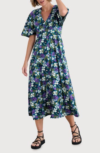 An Empire waist adds shape to a short-sleeve maxi crafted from lightweight organic cotton, featuring a fun floral print.