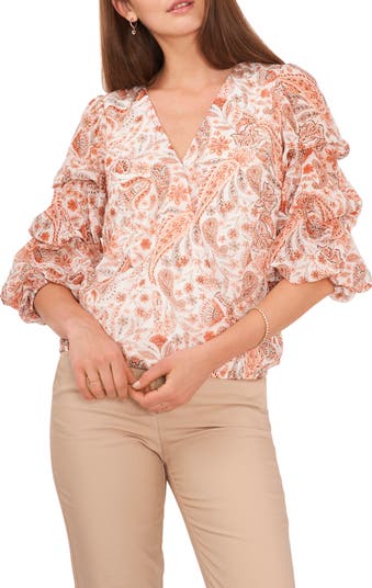 Cascading bubble sleeves amp up the romance in a paisley-patterned chiffon top that hits the spot whether you're at the office or having a date night.