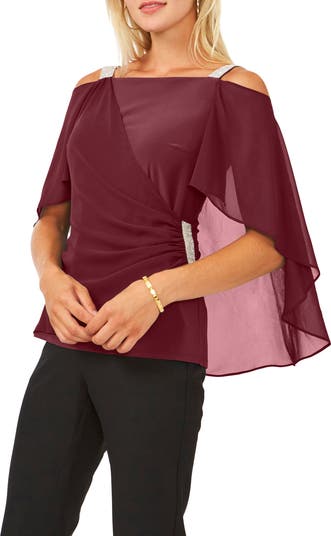 Pop on this light and airy off-the-shoulder top that showcases a sheer cape overlay at the back and glittering rhinestones at the shoulders and side.