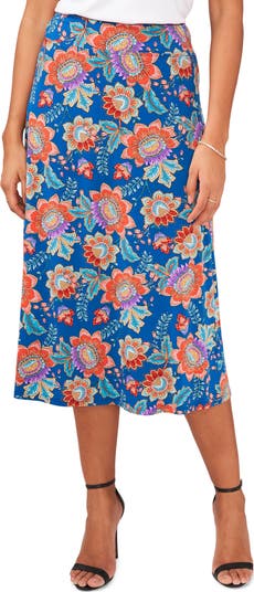 Vibrant allover blooms add a dash of vintage-inspired charm to this lightly draped midi skirt crafted with a touch of stretch.
