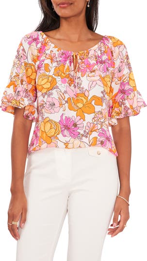 A vibrant floral blouse features an optional off-the-shoulder neckline, keyhole ties and ruffled sleeves for charming style.