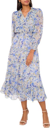 Delightful blooms and shimmering accents romance this chiffon maxi designed with slender neck ties and a smocked waist.
