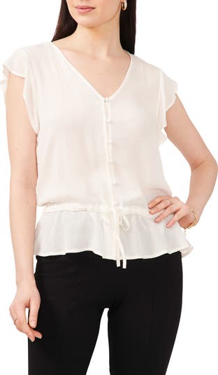 Fluttery cap sleeves frame this button-up blouse cut from a lightweight, textured fabric.