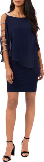 Glamorous sequins detail the sleeve straps of this event-ready minidress finished with a flowing sheer cape.