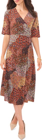 Vibrant mixed patterns energize the look of a faux-wrap midi dress that adds extra sophistication to any occasion.
