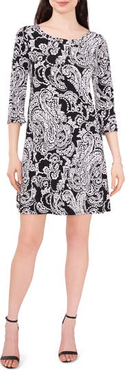This go-anywhere dress is patterned in bold paisley and framed by slightly flared three-quarter sleeves.