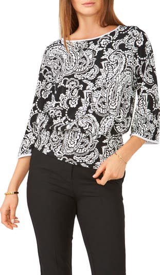 Beloved black-and-white paisley patterns this versatile knit top designed in a deeply flattering blouson silhouette.