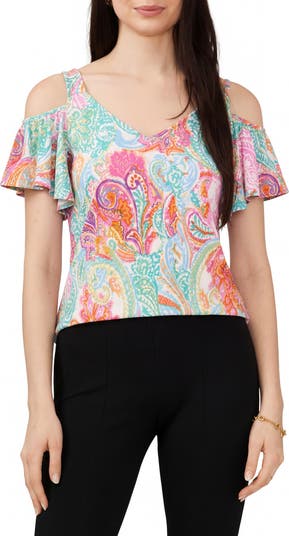 Transition easily from day to night in this printed shoulder-baring top framed by fluttering sleeves.
