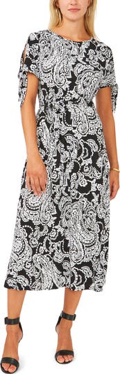A swirling paisley print emboldens this day-to-night midi featuring split sleeves with drapey ties.