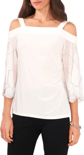 This smooth shoulder-baring blouse features three-quarter sleeves with dazzling rhinestone sparkle.
