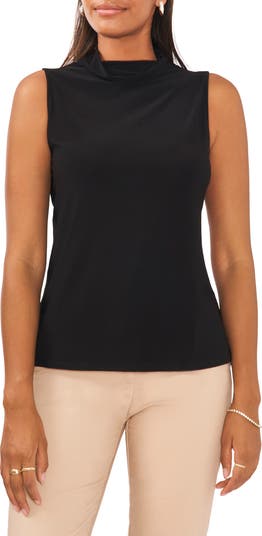 A ruched mock neck sits atop this stately sleeveless blouse that is stylish on its own and stellar as an underlayer.