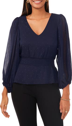 Sweet smocking and a swirling peplum animate this metallic clip-dot blouse made from an airy fabric.