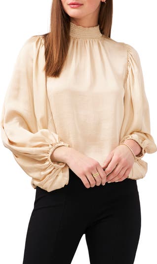 Lustrous and chic, this fabulous blouse features a smocked mock neckline and long billowy sleeves for a party-ready look.