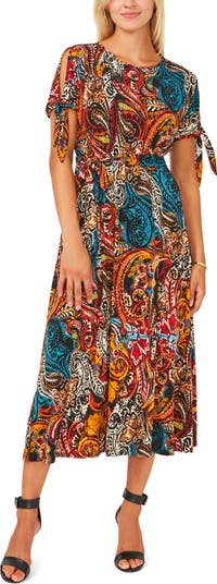 An allover print enlivens this tie-waist midi featuring split sleeves with drapey ties.