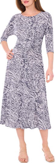 A drapey tie tethers the waist of this lively printed midi designed with easy-moving stretch for a figure-skimming fit.