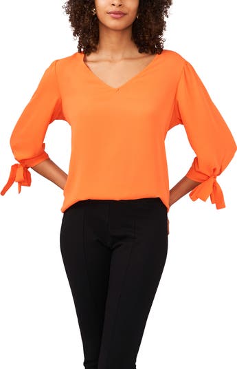 Offered in a variety of appealing hues, this lightweight V-neck blouse features charming puff sleeves tethered with dainty ties.