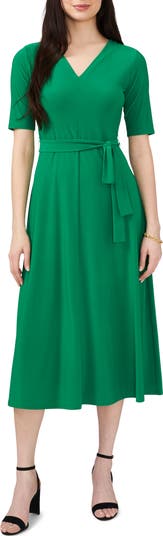 A defining tie belt tethers the waist of this day-to-night midi framed by abbreviated sleeves.