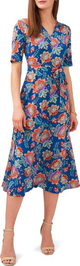 A defining belt tethers the waist of this lively printed midi crafted with curve-skimming stretch.