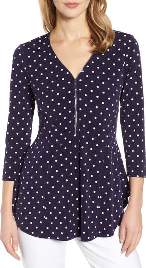 A shiny front zip adds eye-catching edge to this swingy top styled with abbreviated sleeves and a curved shirttail hem.