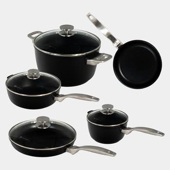 The Swiss Diamond CHD 10 Piece Nonstick Cookware Set includes an 8-inch frying pan, 9.5-inch frying pan, 4.3-quart sauté pan with a 9.5-inch lid, 3.2-quart saucepan with an 8-inch lid, 2.2-quart saucepan with lid, and an 8.5-quart stockpot with lid. Made in Switzerland, each piece uses a hybrid ceramic and diamond-infused nonstick coating for exceptional durability and easy food release. The even-heating, warp-resistant body eliminates hot spots, while the rivet-free interior ensures simple cleanup. Oven safe to 500°F and compatible with gas, electric, ceramic, and halogen cooktops.