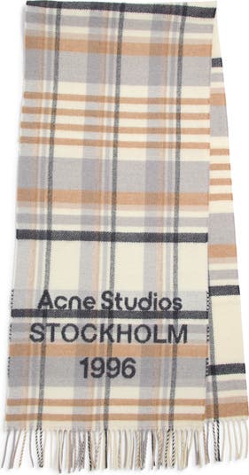 Bold logo lettering details this neutral check scarf knit from a sot wool blend and finished with fringe.