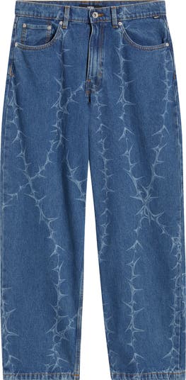 Head out for the skate park in jeans cut from durable, nonstretch cotton denim and featuring a low-slung profile that stays roomy down the legs for easy movement. The barbed-wire print adds a cool element to enhance your look on the half-pipe.