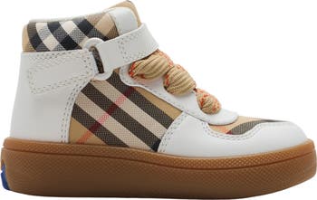 A pair of high-top sneakers in Burberry Check cotton and supple leather. The mesh-lined style features check laces and rubber soles moulded with archive Burberry lettering. ||Velcro strap closure |Leather insole |Burberry lettering at sole