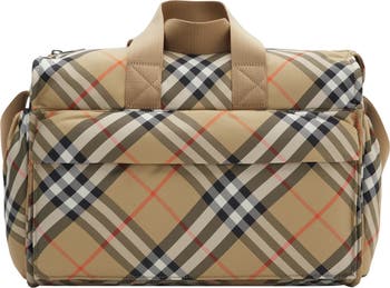 A spacious baby changing bag made from nylon woven with the Burberry Check and lined in a solid colour. The style features multiple pockets for organisation and comes with a padded changing mat.||Webbing top handles|Adjustable shoulder strap|Zip closure|Two exterior Velcro flap pockets, two exterior elasticated pockets, three interior slip pockets|Polished metal hardware|Comes with a dust bag