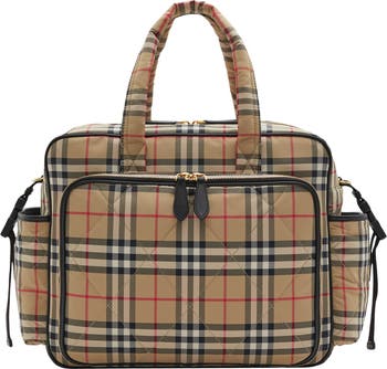A baby's changing bag in quilted Burberry Check with a nylon lining. The design is trimmed in leather and features multiple pockets and a fold-out changing mat.||Detachable, adjustable webbing strap|Two-way zip closure|Exterior zip pocket with foldout changing mat, two exterior pouch pockets, interior zip pocket|Hand-painted edges|Polished metal hardware|Silicone patch with raised Burberry lettering|Nylon lining
