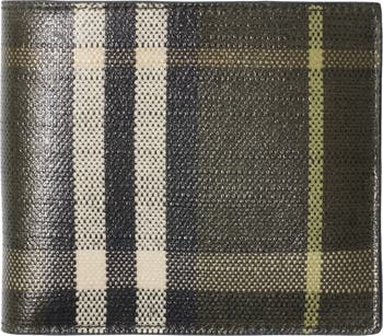 A bifold wallet made from a cotton linen blend backed in supple leather. The fabric is jacquard-woven with the Burberry Check and has a coated finish inspired by rainwear.||Eight card slots|Note compartment with divider|Two slip pockets|Hand-painted edges|Embossed Burberry lettering at inner|Comes with a dust bag