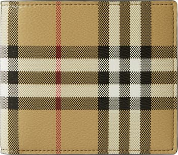 A bifold wallet in Burberry Check. The design is lined with smooth calf leather and sized to fit all currencies.||Eight card slots|Note compartment with divider for all currencies|Two slip pockets|Hand-painted edges