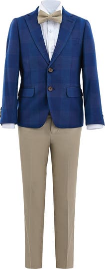 A polished ensemble for standout occasions—this tailored look blends classic charm with modern flair, perfect for weddings, portraits, or stylish celebrations. Blue checkered blazer with notched lapel and beige bow tie. Coordinated beige trousers and crisp white shirt for a refined finish.
